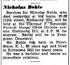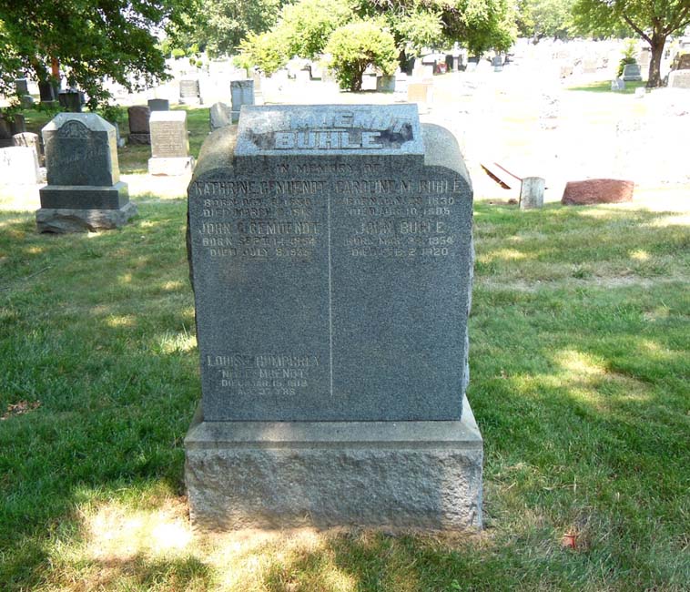 You just never know where or when you’re going to find another leaf in your family tree. My husband Randy found a new online database with a transcript of Katarina’s son, Nicholas’ death certificate. The transcript says he was buried at Evergreens Cemetery in Brooklyn, New York. So, he called the cemetery, hoping to find other Buhles buried there. Well, great news, they told him Nicholas was in a family plot, in the Nazareth Section, with five other family members! The cemetery gave us the last names and first initial of the other family members, along with the date of internment for everyone. So besides Nicholas, who was the last to be interred, dying in 1941, they gave us, CW Buhle -d. 1905, K Gemuendt – d. 1913, L Humphrey – d. 1919, J Buhle – d. 1920, and JJ Gemuendt – d. 1935.