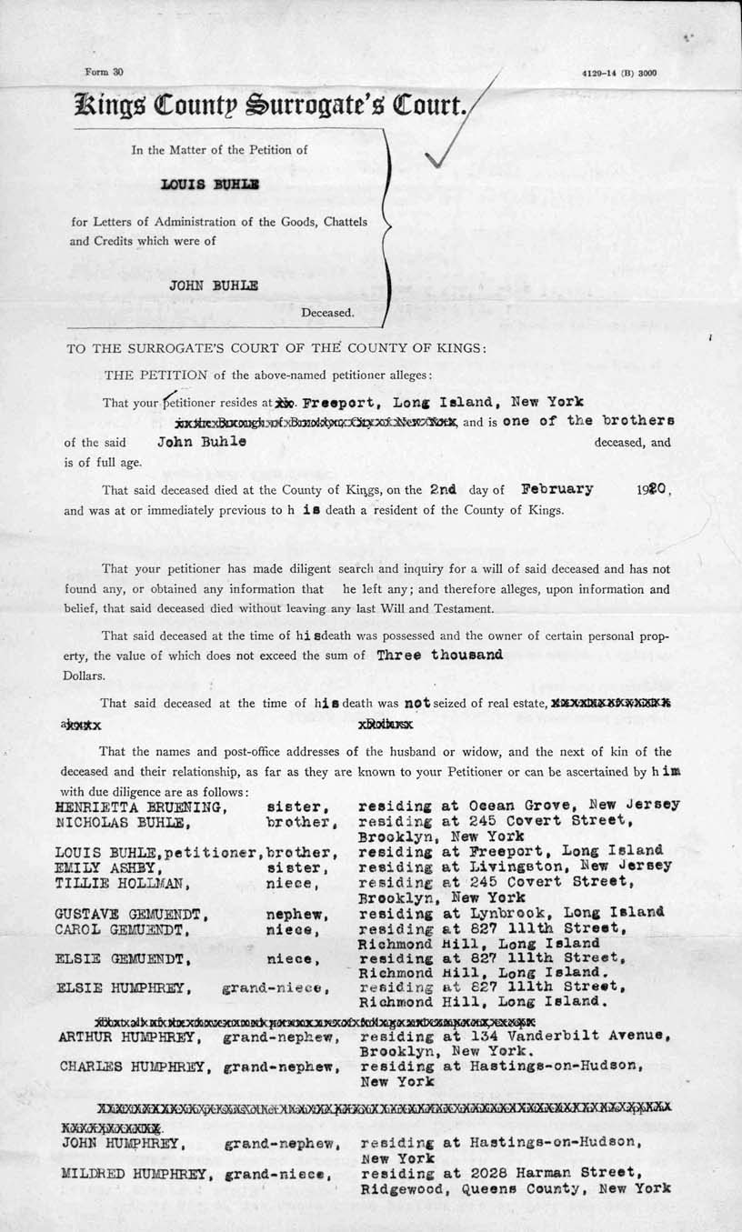 So, with the CW Buhle’s 1905 death date, Randy returned to search the new Family Search New York City Death Index. He found a transcript of a Carolina Magdalena Buehle’s death. We were pretty sure it was our Katarina, even though the transcription was not so good, stating her age at death as 25 and it didn’t match the CW we got from the cemetery, but it did list her interred at Evergreens, and they had her maiden name as Battenhauser, and the death date matched what the cemetery had. With that transcript and her son John’s will, we decided we should get a copy of the death certificate, it’s always good to see the original, as some transcriptions are not always accurate. On a side note, I just want to say that Family Search is an great search tool and they are adding data daily, using volunteers, including Randy & I, for transcribing. Even though I say the transcriptions are not always accurate, all of us are really doing our best to get it right.